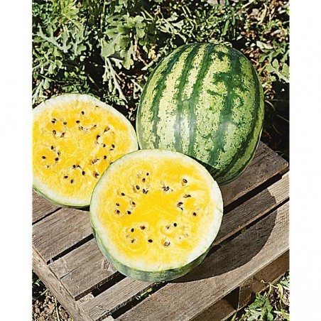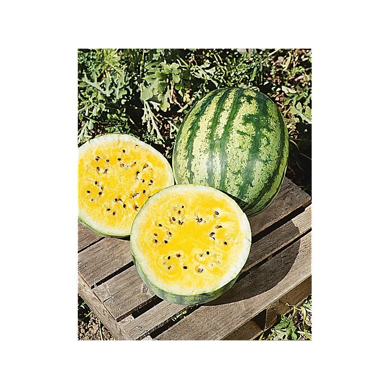 Productive. Fruits assez petits (2 à 4 kg) de couleur vert clair, marbrés de vert foncé. Chair jaune, lumineuse, comme la lune. Excellente pastèque, très sucrée, craquante et juteuse.